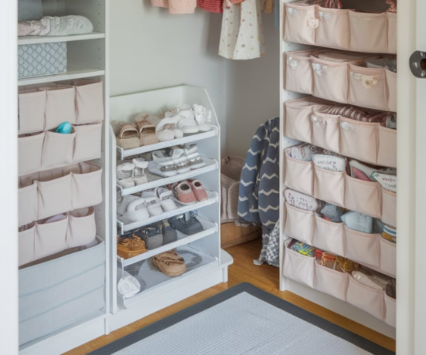 I prefer using drawers to organize clothes for babies. The items are small and it ends up being more annoying to hang things. Fabric clothes organizers are my preference and you can get cheap ones from Amazon or IKEA that will last for years.